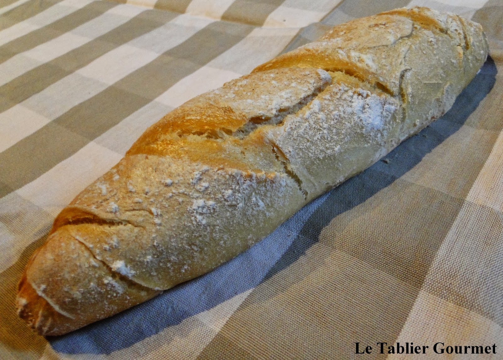 4. Pour la cuisson, on fait préchauffer le four à 250°C et sur la grille du haut, on met un récipient avec de l’eau. Le temps que ça préchauffe, on farine légèrement les baguettes puis on les incise. Une fois que le four est chaud, on met nos baguettes sur la grille la plus basse pour 25 à 30 minutes. Comme toujours, on ne se fie pas tout à fait à cette durée et on fait attention à la coloration.