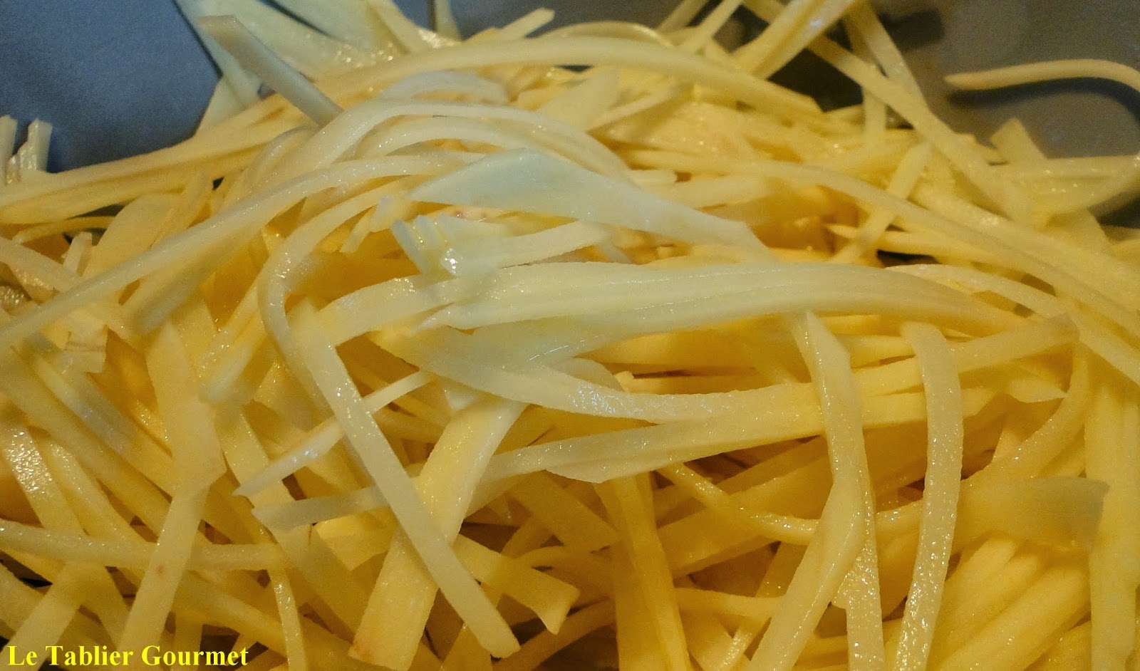 2. Pour cette étape, c’est un peu au choix et selon les instruments que chacun a sous la main : le but étant d’obtenir une fine julienne de pommes de terre. Le plus simple est d’avoir une mandoline qui se charge de cela très bien. Surtout, avec la mandoline on fait très attention aux doigts. On peut aussi opter pour une râpe à légumes (manuelles ou dans le robot) mais il faut faire attention car le but est d’obtenir de longs filaments. Or, d’expérience avec une râpe, on a tendance à obtenir de petits morceaux. Enfin, on peut choisir une méthode un peu plus traditionnelle. Avec le couteau, on fait de fines tranches dans la hauteur de la pomme de terre. On entasse quelques unes de ces tranches et on taille en fine julienne. C’est un peu long et dangereux pour les plus maladroits mais rien d’insurmontable. Quoi qu’il en soit, il ne faut surtout pas rincer la julienne car c’est l’amidon qui permettra d’obtenir la galette. On n’oublie pas de saler et de poivrer sa julienne.