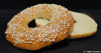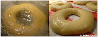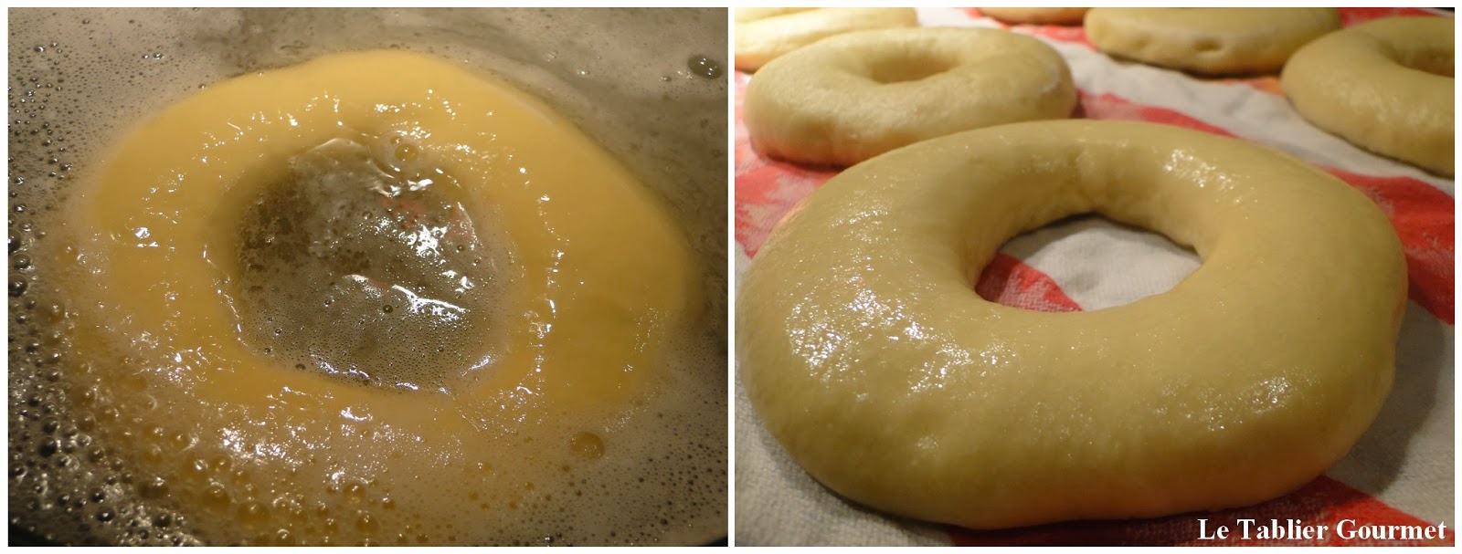 Astuces :– Même si c’est un peu plus long, je pense que le mieux est de les pocher un par un (Mercotte conseille par trois). Je les retourne avec un écumoire.– Il ne faut pas hésiter à tourner le bagel rapidement pour que le trou du centre se forme, d’autant que la pâte est très résistante.