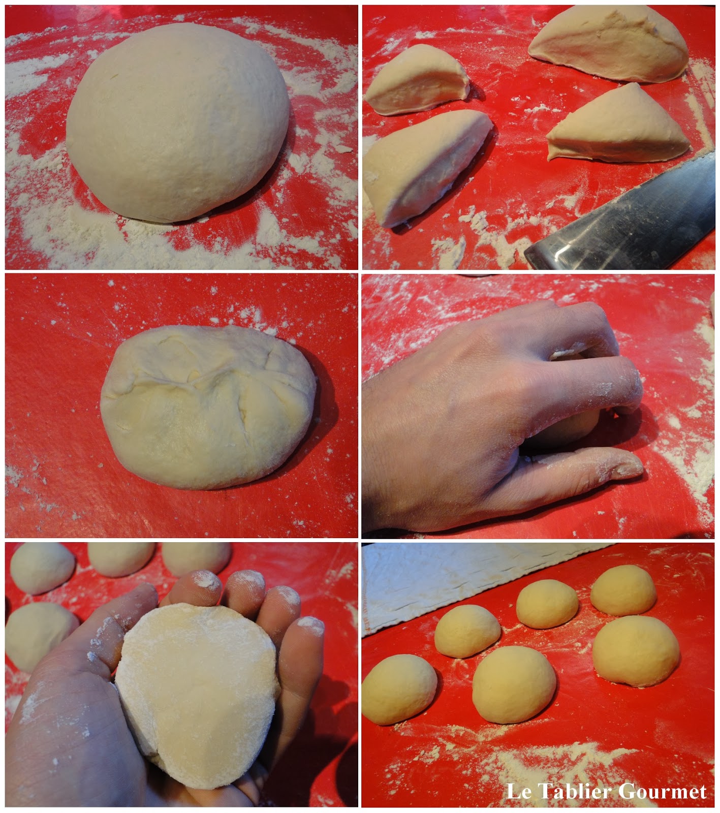 2. Sur le plan de travail fariné, on forme un beau pâton qu’on divise en 6 parts égales (120/125 g). Ensuite, avec chaque portion, on doit former une boule. Pour cela, on place la clé en dessous et on va emprisonner le pâton sous la paume et faire des mouvements circulaires. La forme sphérique devrait alors apparaitre d’elle-même.