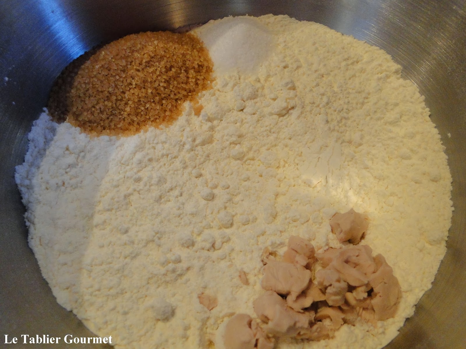 1. Dans la cuve du robot ou un saladier, on met la farine, la levure, le sel et le sucre, en faisant attention de bien séparer la levure et le sucre/le sel. On pétrit alors pendant 8 à 10 minutes pour obtenir une pâte homogène et qui est un peu élastique et colle légèrement aux doigts.