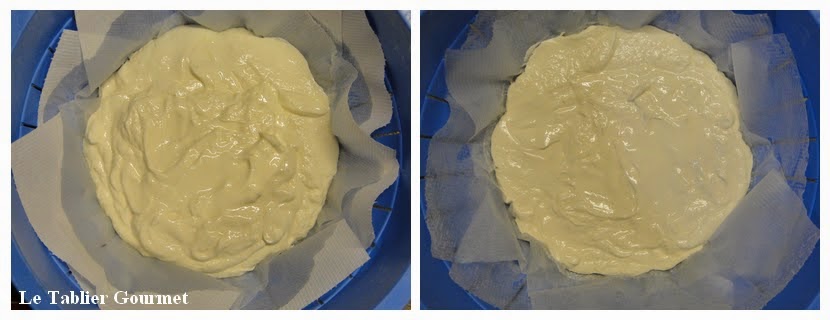 1. La veille au soir, on vide les pots de fromage blanc dans la passoire tapissée de papier absorbant qui servira de filtre. On met un saladier en dessous pour récupérer le liquide qui va s’égoutter. On place le tout au réfrigérateur pour une douzaine d’heures.