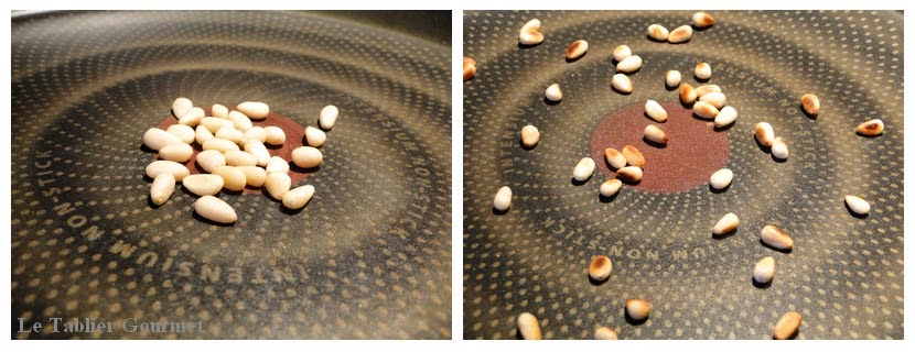 1. On allume le grill du four sur 250° C, c’est la puissance maximale chez moi. Pendant ce temps, on fait torréfier les pignons à la poêle, sur feu moyen pour éviter qu’ils ne brûlent. On remue et quand ils ont une belle couleur caramel, on les réserve.