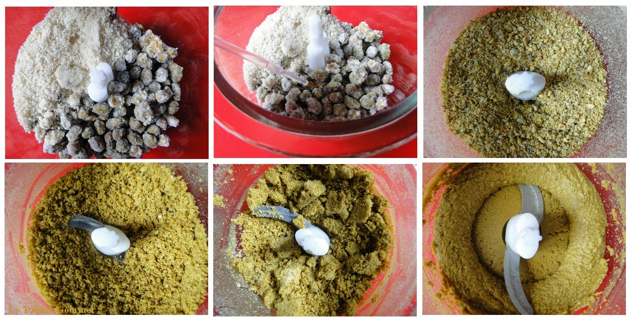 3. On place nos pistaches recouvertes d’une pellicule de sucre blanc dans le mixer, avec la poudre d’amande et l’amande amère. On mixe quelques temps puis on rajoute l’huile.