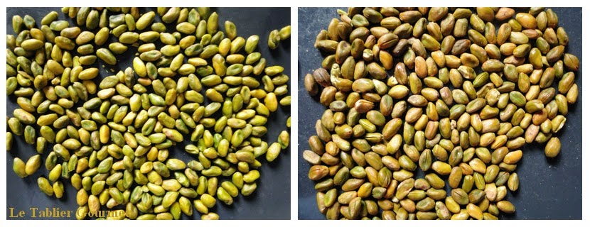 – La pâte de pistache est réalisée maison : elle ne contient pas (ou très peu) de bidules chimiques qui donnent la « belle » couleur verte fluo à la pâte industrielle :-). En prime, l’absence des bidules chimiques se ressent vraiment au goût : c’est de la pistache et non une pâte-qui-devrait-avoir-le-goût-de-la-pistache-mais-en-fait-non. La pâte revient bien moins cher, même si le coût des pistaches crues reste assez élevé.