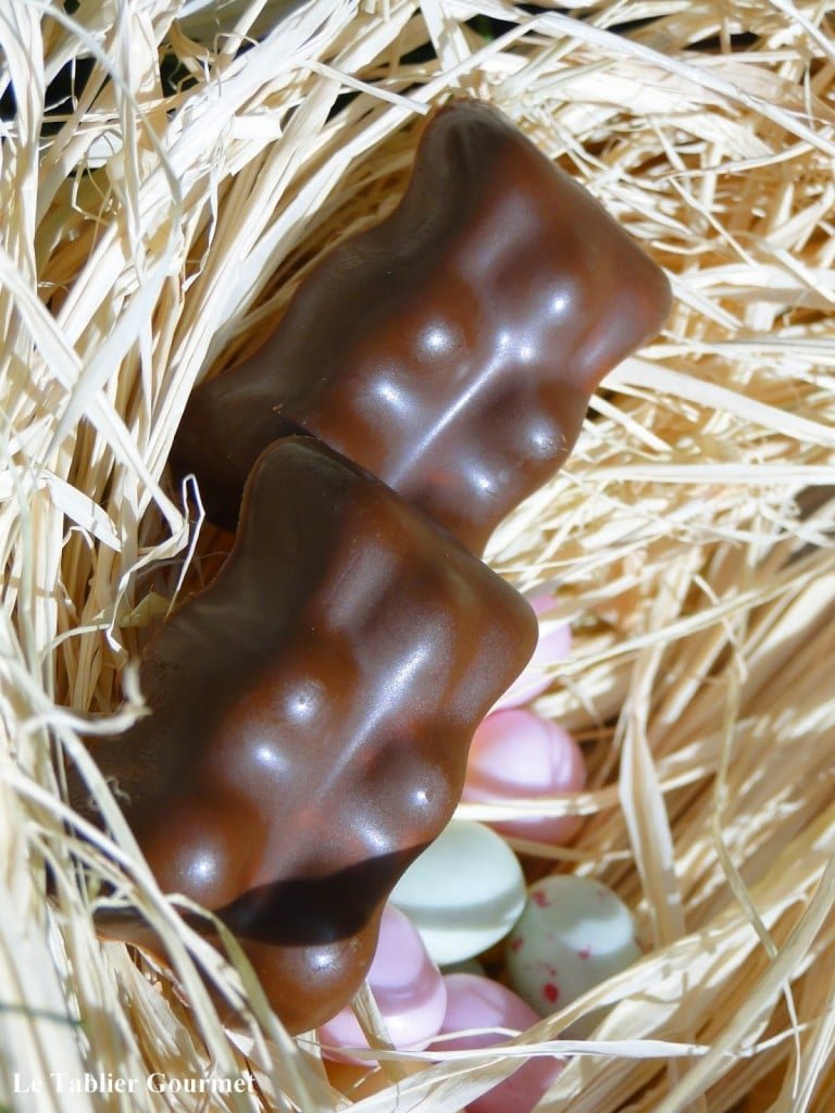 Je n'ai pas encore osé me lancer dans cette recette et tes oursons sont tellement beaux que je vais la garder pour le jour où j'ai "quelques heures à tuer' 🙂 et sans tempérer le chocolat bravo car cette étape est pénible !