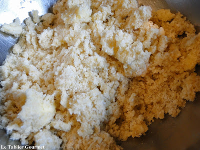2. On prépare la pâte à crumble en mettant tous les ingrédients dans un cul de poule : la farine, le sucre, la coco et le beurre. Du bout des doigts, on émiette. Lorsqu’on obtient une texture sablée, on dépose la pâte sur les fruits.