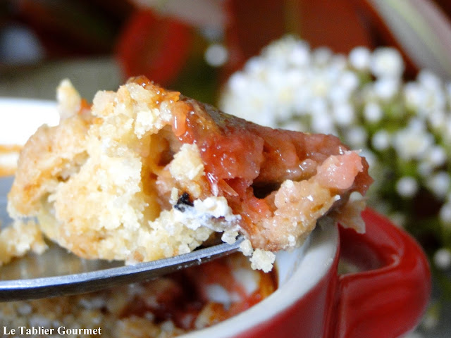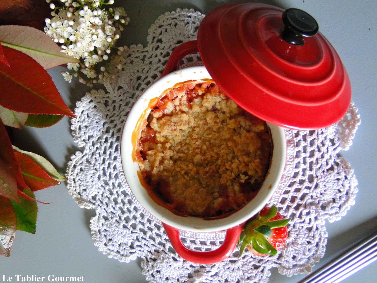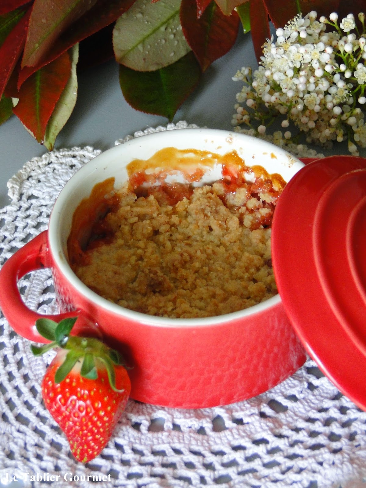 Astuces :– Un crumble, ça ne se démoule pas et la pâte contient pas mal de beurre. Par conséquent, je ne beurre pas mes moules/mon plat.– Concernant la coco, j’ai plusieurs choses à vous proposer. 1/ pour les amateurs de coco, on peut mettre 30 g. 2/ pour tous les autres, avec 20 g vous ne sentirez quasiment pas le goût de la coco, une légère pointe seulement. 3/ pour ceux qui n’aiment pas la coco, on peut la remplacer par de la poudre d’amandes (plus neutre en goût) voire carrément par de la farine.– L’idéal est de réaliser la recette avec de la rhubarbe fraiche. Toutefois, ça se passera très bien avec de la rhubarbe congelée (j’utilise celle de chez Picard quand il n’y en a pas chez ma primeure : un bon rapport qualité/prix). La seule chose, c’est que le processus de congélation ayant tendance à faire ressortir l’eau des aliments, il faudra bien l’égoutter (voire la presser) pour en extraire un maximum d’eau pour éviter que votre crumble ne se transforme en soupe (j’exagère un peu mais pas tant que ça).– Selon votre goût, vous pouvez ajuster les quantités de fraise ou de rhubarbe mais il faut faire attention car, à la cuisson, la fraise rend beaucoup de jus, ce qui risque de détremper légèrement le crumble.– Souvent, on déguste le crumble tiède avec une boule de glace vanille et/ou une quenelle de Chantilly.