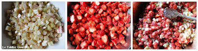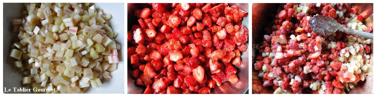1. On commence par éplucher et couper la rhubarbe en petits dés. On fait de même avec les fraises. On mélange les deux fruits et on ajoute les 4 cuillères à soupe de sucre. On répartit équitablement ce mélange dans 4 ramequins (ou un grand plat).