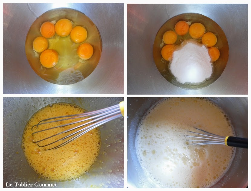 – Il est vraiment important de ne pas cuire les œufs lorsque l’on verse le lait. Pour cela, je vous conseille d’être deux. Ainsi, pendant que l’un verse, l’autre peut tenir le saladier et donc fouetter vivement.
