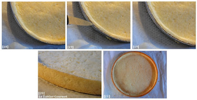 7. On place la pâte au four pour 15 à 20 minutes. A ce moment-là, la pâte doit commencer à être cuite mais encore blanche [18 et 20] (elle n’est plus brillante mais terne) : on enlève alors le riz, le papier sulfurisé et le cercle (au besoin, très délicatement, on fait passer la pointe d’un couteau le long du cercle [19]). On poursuit la cuisson 10 à 15 minutes jusqu’à ce que la pâte soit cuite et dorée [21].