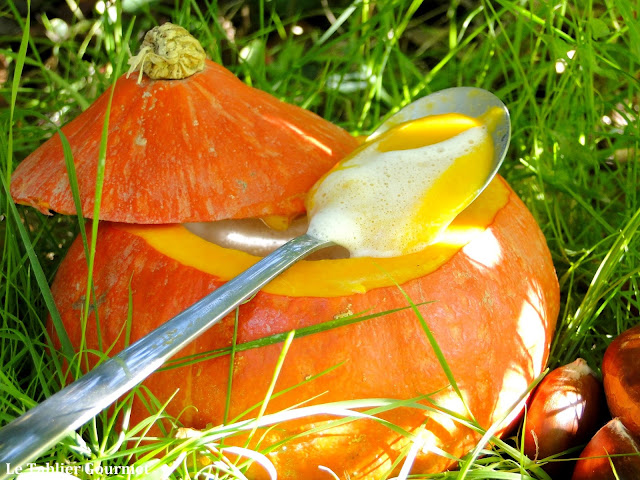 – Quand je fais une recette de chef, je suis un peu bête et discipliné : j’applique sans réfléchir (et parfois, ça me fait mal au ventre). Là, Florent Ladeyn précise bien qu’il ne faut pas éplucher les potimarrons. Vu la dureté de la peau, je voyais déjà la catastrophe après mixage : une soupe dans laquelle surnagerait de petits morceaux de peau immangeables. Pour autant, bête et discipliné, j’ai appliqué les préconisations du Chef et j’ai bien fait ! On évite l’épluchage laborieux et il n’y a rien du tout dans la soupe ! D’ailleurs, comme vous gardez la peau de votre potimarron, achetez-en un bio !