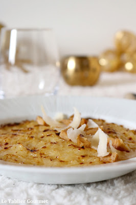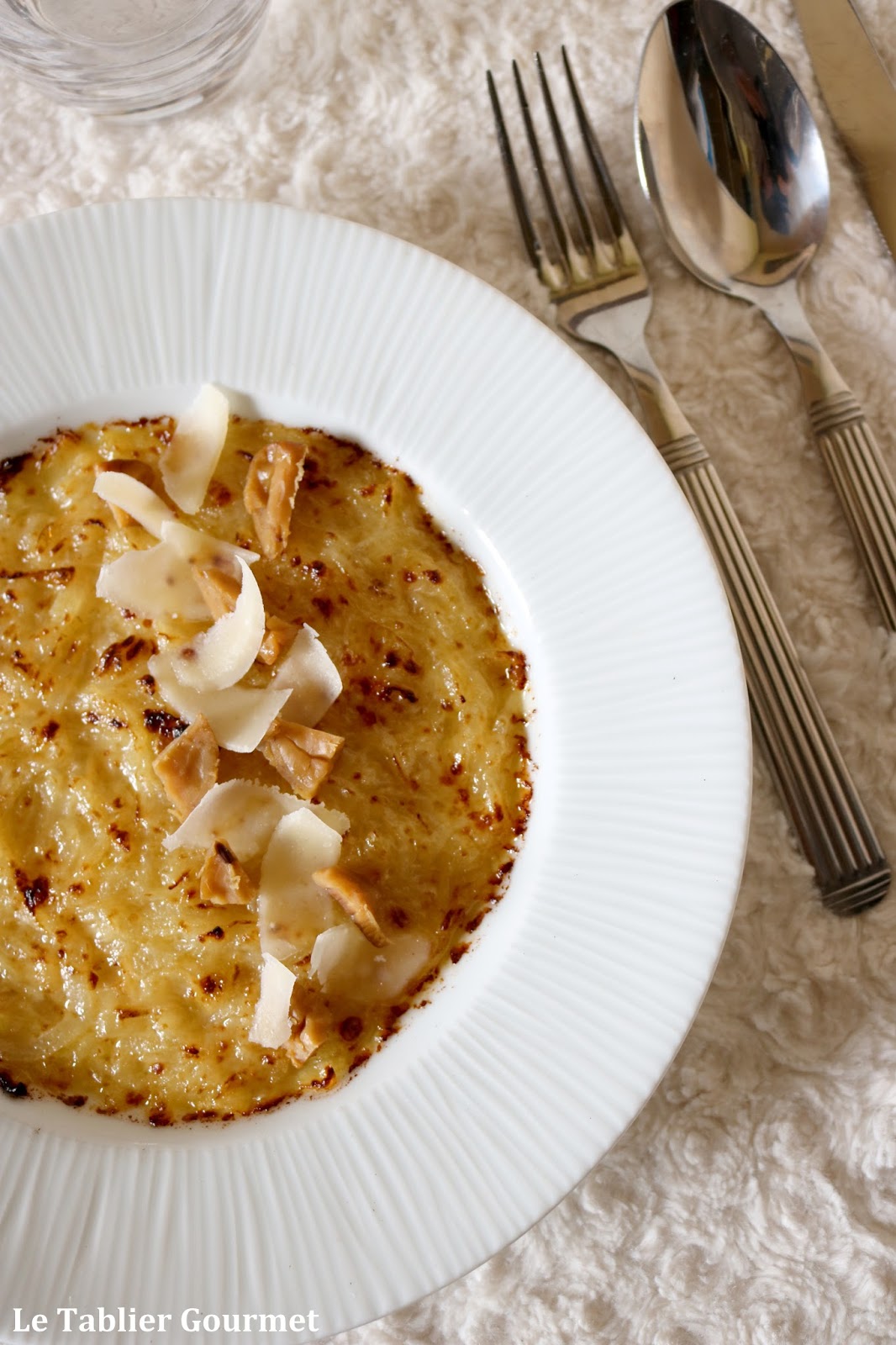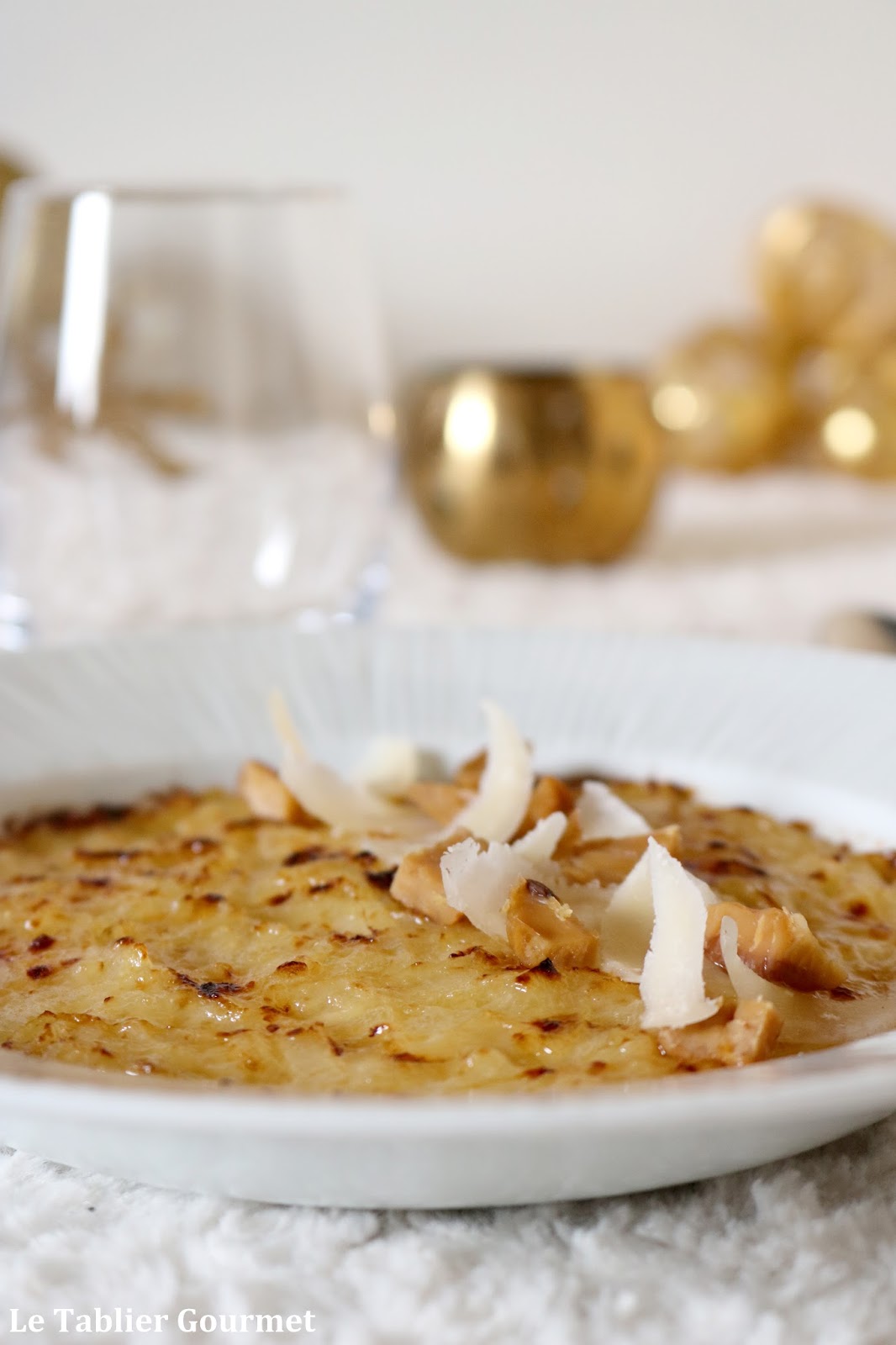 Vous n’aurez pas d’entrée à base de viandes, cette année, mais une entrée végétarienne (qui pour autant n’est pas particulièrement légère vu la quantité de beurre et de fromage intégrée) ! J’aime beaucoup cette idée de présenter une entrée qui change de ce que l’on fait d’habitude. C’est du simple mais de l’efficace, une entrée tout en douceur et en justesse (Alain Passard, quand même : si vous ne connaissez pas, c’est « L’arpège », 3 étoiles et 5 toques).