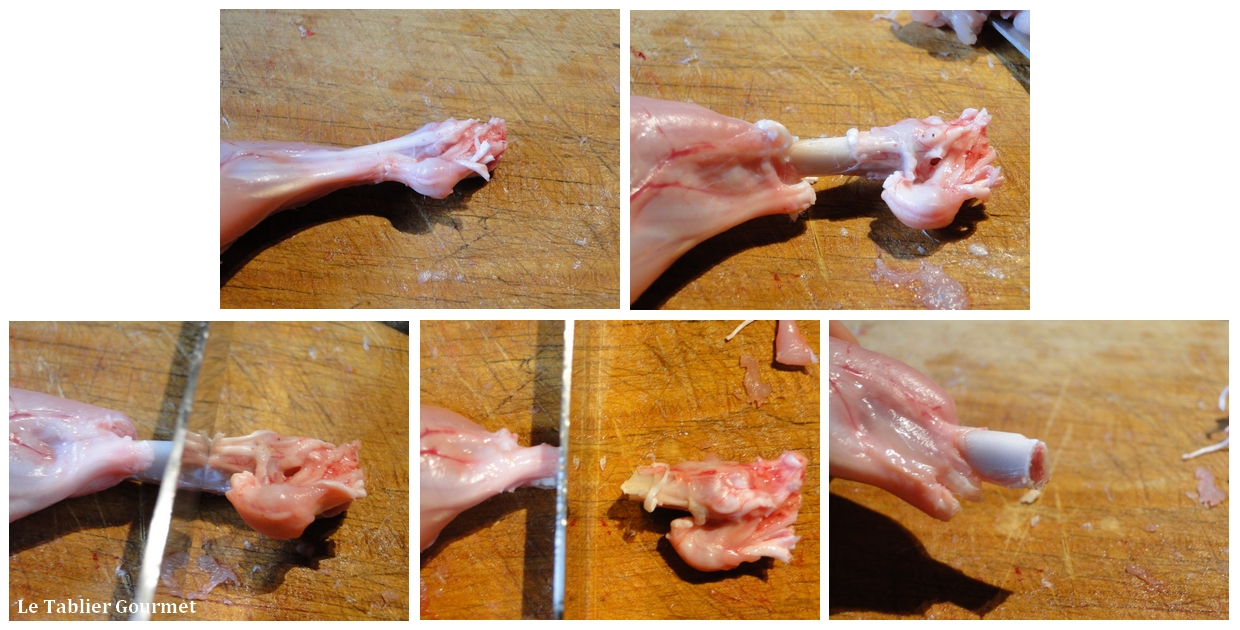 1. Il faut commencer par désosser une partie de chaque cuisse. Je n’ai pas LA technique mais ma technique. Pour cela, j’entaille le long de l’os. Je désosse petit à petit en longeant l’os et en faisant bien attention d’enlever le cartilage du haut de l’os. Ensuite, je retourne ma cuisse, et j’incise le long de l’os. Dès lors, tout doit s’enlever plus ou moins facilement.