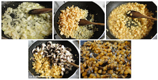3. On réalise la farce : on fait une brunoise avec la pomme (épluchée et lavée), les champignons (épluchés et lavés) et l’oignon (épluché aussi, bien sûr). Dans une noix de beurre, on fait légèrement suer l’oignon, puis on ajoute la pomme que l’on fait aussi légèrement suer. On déglace avec le vin blanc avant d’ajouter les champignons. Lorsque c’est cuit, on rectifie l’assaisonnement de la farce.