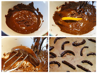 3. A l’aide d’une fourchette, on immerge un par un les segments dans le chocolat. On les égoutte au maximum et, au besoin, on s’aide du rebord du bol pour enlever l’excédent de chocolat. On dépose alors délicatement les orangettes sur du papier sulfurisé/feuille SILPAT. Une fois toutes les orangettes réalisées, on place au réfrigérateur. Il ne reste plus qu’à déguster.