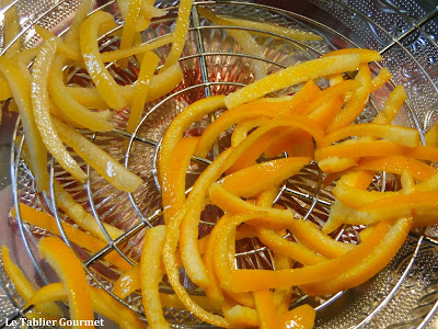 4. Dans une casserole, on met 125 g de sucre et 25 cl d’eau. On porte à ébullition pour former un sirop. On met alors les zestes d’orange dans ce sirop et on fait bouillir 2 minutes. On fait de même pour les citrons, si ce n’est que les proportions du sirop sont légèrement différentes (150 g de sucre et 25 cl d’eau).
